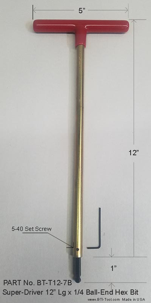 Ball-End - Super-T-Driver 12in. Lg. Available in Sizes 5/64 - 7/8 - Extra length extra strength T-handle drivers with cushion grip for comfort. All have Replaceable Bits. Available in 7pc Sets with Metal Stand. - Sizes Ranges 5/64 - 7/8 - L= 18in. length. - HW= 4 - 6in. depending on the size. - Available in 6in. 12in. 18in. and 24in. lengths. - High Torque - Metric & Fraction - Lifetime guarantee on the T-Handle/Bit holder. - Bits are held in by a set screw for easy replacement. Heat treated aircraft type 4140 steel main shank is broached and includes the replaceable straight hex key Bit as shown which is heat treated 8650 premium quality steel and meets specifications of 55-201.